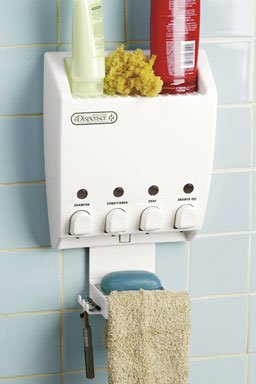 The most attractive, practical, convenient way to �de-bottle� the Shower! Better Living Products', The Dispenser, is the quality leader and stands at the forefront of this category throughout the world. This unit features a top shelf for extra storage, a soap dish, hooks and a face cloth bar.