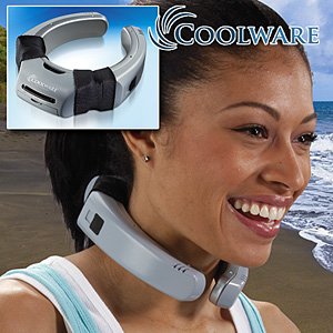 Keep your cool all summer long! The portable Coolware Cooling System with powerful built-in fan and refillable 2 oz. water reservoir is like a personal air conditioner you can wear anywhere you go. Two speed settings, high and low, cool your body to the core to beat the heat whether active outdoors or at rest indoors. Anti-bacterial fabric. Anodized aluminum construction. Requires one AA battery, included. Plastic, 8 x 2 x 3'.