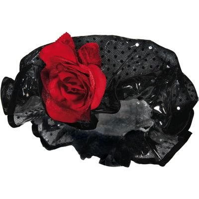 If you need to protect your perfect hairdo while showering or bathing, why not have a ball at the same time with this Fun and Fancy Shower Cap? Elasticized opening; one size fits most. Awesome gift for the young at heart. Vinyl cap with sequined mesh cover. Fun red flower accent. One size fits most .