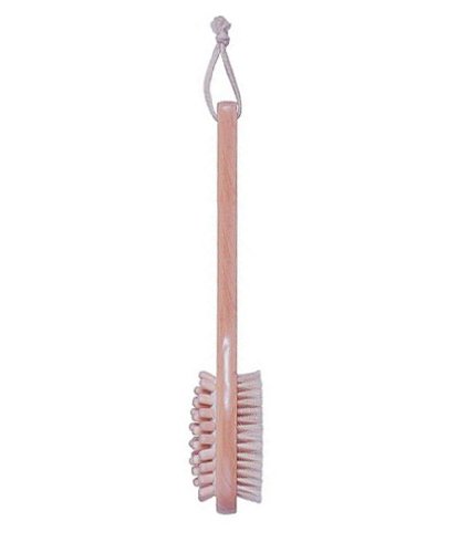Aquabella massaging bath brush has natural bristled brush. It is a soothing massager. Great with any shower gel or soap. 12 inches long. Easy to use. Easy to hang.