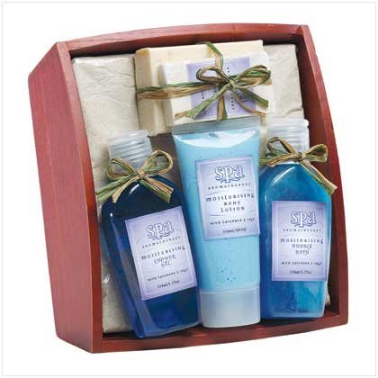 A tasteful, polished wood tray contains a full line of lavender and sage scented bath products and loofah sponge. Appealingly accented with ribbons and bows! 7 1/2'' x 2 3/4'' x 7 1/2'' high.